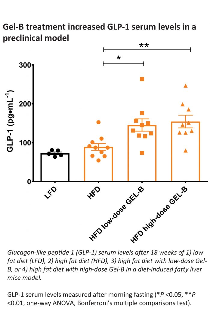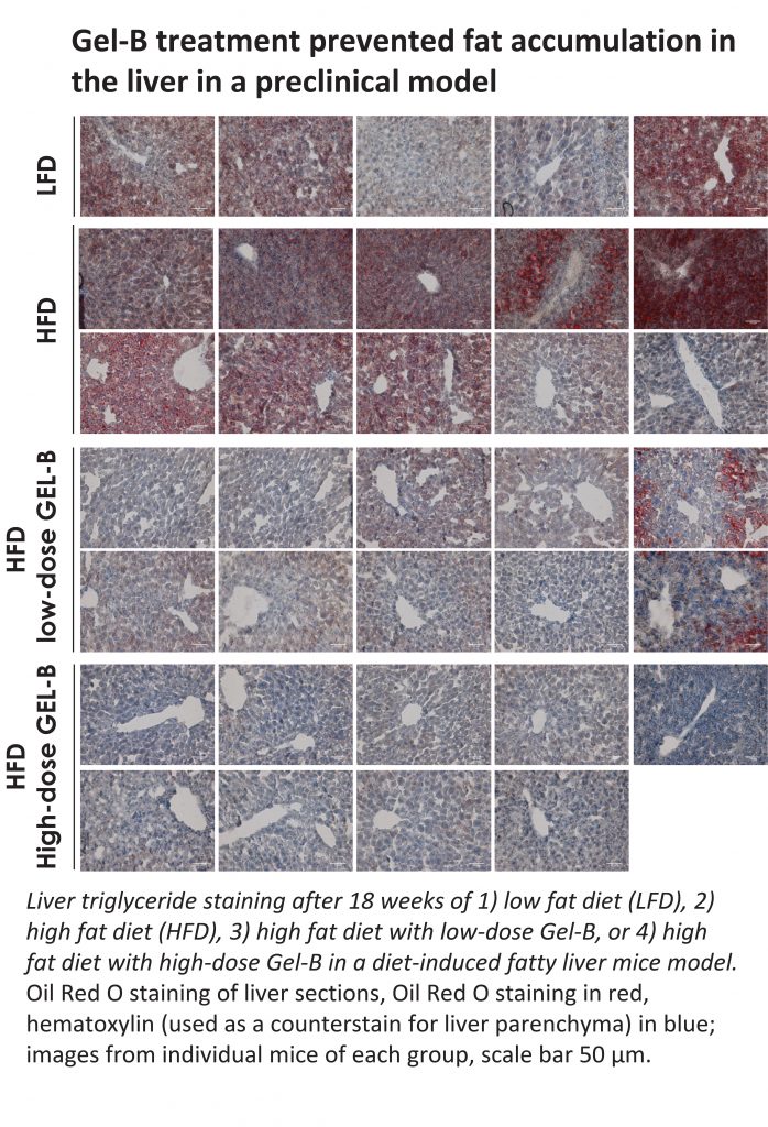 The latest data presented today suggest that Gel-B not only has a protective effect on the gut barrier but may also work to prevent liver and metabolic disorders associated with high-fat diets. In the study, mice fed a high-fat diet and treated with Gel-B were protected from developing non-alcoholic fatty liver disease (NAFLD), insulin resistance and excessive weight gain.