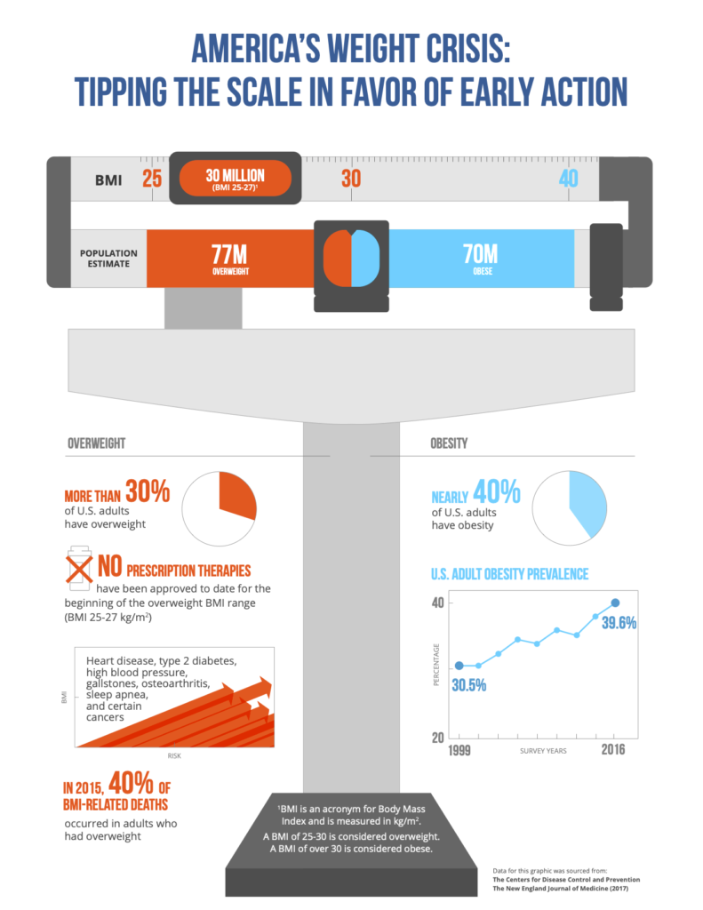 Less than half of the approximately 150 million adults in the U.S. struggling with overweight and obesity (BMI 25 kg/m2 to 40 kg/m2) meet the clinical threshold for obesity (BMI > 30 kg/m2). Yet the health burden of excess weight begins before the onset of obesity, with approximately 40% of BMI-related deaths in 2015 occurring in overweight adults with a BMI <30 kg/m2. Studies show even modest weight gain in early adulthood is strongly associated with critical outcomes such as cancer risk and mortality.