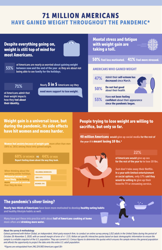 The pandemic has been the catalyst for significant change in American lives, especially for those actively trying to lose weight. It has posed physical health issues and emotional ones as well with 71% of Americans admitting that their weight impacts how they feel about their identity, particularly among women and parents. However, as a new year approaches, the survey also found that, months into the pandemic, Americans are more determined than ever to lose weight and maintain healthy habits.
