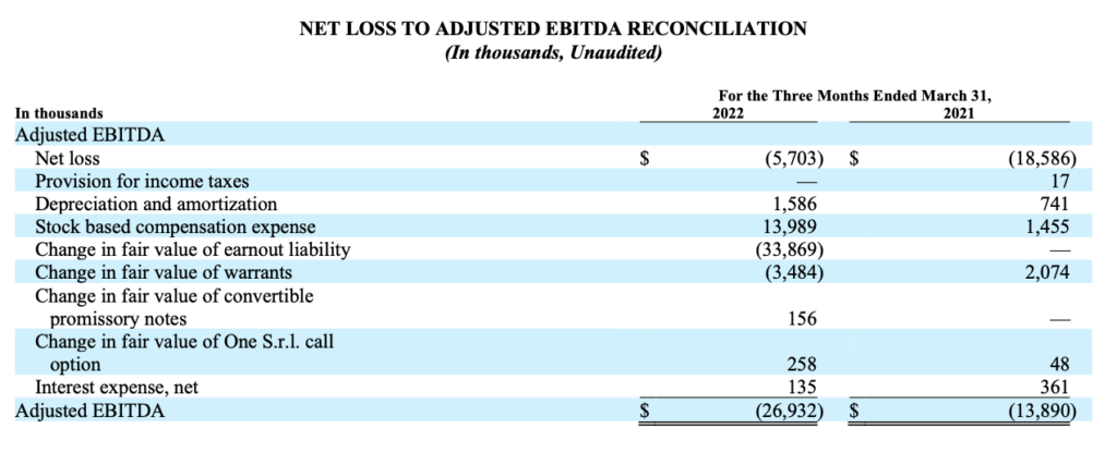 In addition to our financial results determined in accordance with GAAP, we believe that Adjusted EBITDA, a non-GAAP measure, is useful in evaluating our operating performance. We define “Adjusted EBITDA” as net (loss) income before depreciation and amortization expenses, provision for (benefit from) income taxes, interest expense, net, stock-based compensation and (gains) and losses related to changes in fair value of our warrant liability, our convertible promissory note liability, our tranche rights liability and the One S.r.l. call option. We use Adjusted EBITDA to evaluate our ongoing operations and for internal planning and forecasting purposes because it facilitates internal comparisons of our historical operating performance. We believe that this non-GAAP financial measure, when taken together with the corresponding GAAP financial measure, net loss, provides meaningful supplemental information regarding our performance by excluding certain items that may not be indicative of our business, results of operations, or outlook. We consider Adjusted EBITDA to be an important measure because it helps illustrate underlying trends in our business and our historical operating performance on a more consistent basis. We believe that Adjusted EBITDA is helpful to our investors as it is a metric used by management in assessing the health of our business and our operating performance.