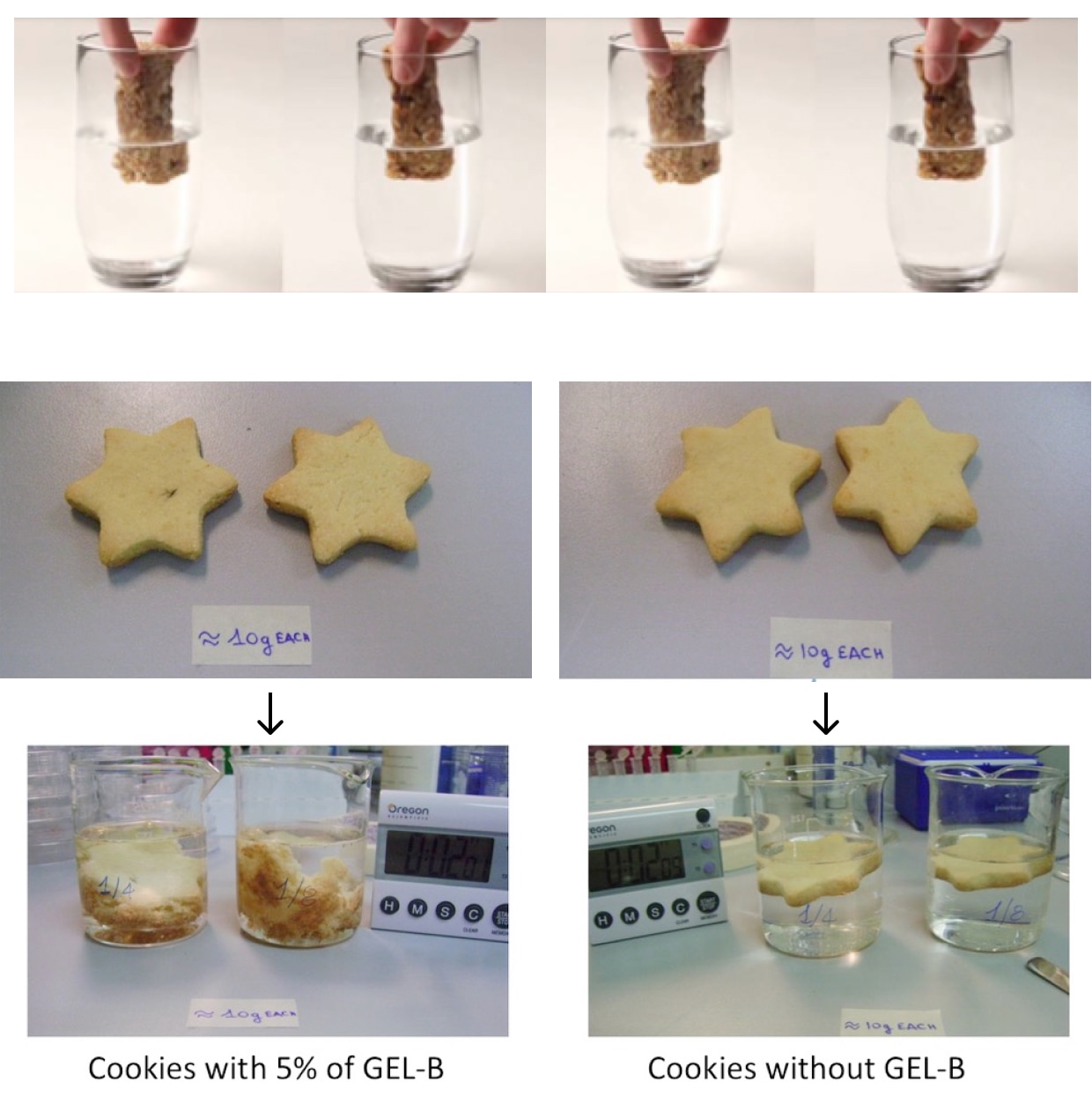 - Rispetto all’OR1 e all’OR3, a partire da G200 è stato messo a punto il materiale GELB idoneo all’integrazione in alimenti. Pur avendo proprietà di rigonfiamento e viscoelastiche simili a quelle di G200 (media uptake min. 60 g/g vs. 50 g/g, rispettivamente per G200 e GELB; modulo elastico G’ min. 1500 Pa vs. 1400 Pa, rispettivamente per G200 e GELB), GELB è stato specificatamente progettato per l’integrazione in prodotti alimentari, attraverso una opportuna modifica del suo processo di sintesi tesa a: (a) ridurre il costo di produzione; (b) consentire l’incorporazione del gel in prodotti alimentari, preservando i requisiti fisici degli alimenti; (c) consentire l’incorporazione del gel in prodotti alimentari sottoposti a cottura ad alte temperature.